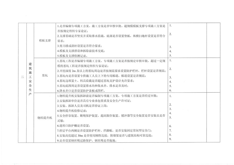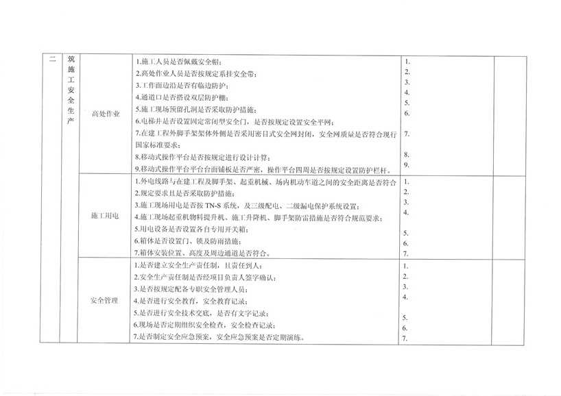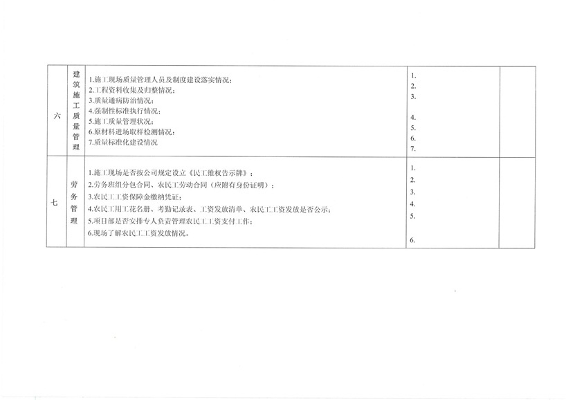 集團(tuán)公司各部室、分公司、項目部: 為繼續(xù)深入開展工程質(zhì)量治理兩年行動,進(jìn)一步加強(qiáng)工程安全、質(zhì)量規(guī)范管理,保障廣大農(nóng)民工合法權(quán)益,促進(jìn)項目工程穩(wěn)固進(jìn)展。公司決定對各在建工程開展秋季安全、質(zhì)量、勞務(wù)及工程質(zhì)量治理“兩年行動”綜合大檢查,現(xiàn)將相關(guān)事宜通知如下: 一、檢查時間安排 2015年10月30日—2015年11月10日 二、檢查組成員 組 長:張濤 副組長:王健 組 員:胡巨偉(負(fù)責(zé)兩年行動、市場檢查,周文淵配合) 陳治明(負(fù)責(zé)勞務(wù)管理,肖家駿配合) 張亞偉(負(fù)責(zé)安全生產(chǎn)管理,李芬芬、藺濤配合) 王 軍(負(fù)責(zé)質(zhì)量管理,王坤海配合) 三、檢查內(nèi)容 1、安全生產(chǎn) (1)項目部安全生產(chǎn)管理制度、廣域網(wǎng)IFA考勤工作及安全管理人員落實情況; (2)深基坑、高支撐、高處作業(yè)等危險性較大的分項工程方案編制、審批、專家論證及施工防護(hù)情況; (3)塔吊、施工升降機(jī)全過程安全監(jiān)控落實和備案、檢測;施工機(jī)械設(shè)備維修、保養(yǎng)臺賬落實情況; (4)腳手架、臨邊洞口防護(hù)、臨時用電布置情況; (5)文明施工、揚塵防治、企業(yè)形象建設(shè)情況; (6)特種作業(yè)人員持證上崗、農(nóng)民工學(xué)校及工人安全教育落實情況; (7)安全資料同步整理情況。 2、質(zhì)量管理 (1)施工現(xiàn)場質(zhì)量管理人員及制度建設(shè)落實情況; (2)工程資料收集及歸整情況; (3)質(zhì)量通病防治情況; (4)強(qiáng)制性標(biāo)準(zhǔn)執(zhí)行情況; (5)現(xiàn)行節(jié)能標(biāo)準(zhǔn)執(zhí)行及施工質(zhì)量管理狀況; (6)原材料進(jìn)場取樣檢測及質(zhì)量標(biāo)準(zhǔn)化建設(shè)執(zhí)行情況。 3、勞務(wù)管理 (1)施工現(xiàn)場是否按公司規(guī)定設(shè)立《民工維權(quán)告示牌》; (2)勞務(wù)班組分包合同、農(nóng)民工勞動合同(應(yīng)附有身份證明); (3)農(nóng)民工工資保障金繳納憑證; (4)農(nóng)民工用工花名冊、考勤記錄表、工資發(fā)放清單、農(nóng)民工工資發(fā)放是否公示; (5)項目部是否安排專人負(fù)責(zé)管理農(nóng)民工工資支付工作; (6)現(xiàn)場了解農(nóng)民工工資發(fā)放情況。 4、工程質(zhì)量治理兩年行動 (1)施工現(xiàn)場是否設(shè)立專人負(fù)責(zé)工程質(zhì)量治理兩年行動; (2)施工現(xiàn)場工程質(zhì)量治理兩年行動資料是否完整; (3)現(xiàn)場資料是否按上級主管部門下發(fā)文件及表格進(jìn)行整理。 各項目部接到通知后應(yīng)將文件內(nèi)容傳達(dá)至各項目管理人員,并立即開展自查自糾,高度重視本次檢查。同時各項目負(fù)責(zé)人、項目經(jīng)理及勞務(wù)專員應(yīng)切實保障農(nóng)民工工資按月足額發(fā)放,杜絕拖欠農(nóng)民工工資行為的發(fā)生。在對本次檢查中發(fā)現(xiàn)的問題公司將下發(fā)限時整改通知單,對不按時整改、不回單、現(xiàn)場較差的項目部公司將進(jìn)行通報批評和嚴(yán)厲處罰。 二〇一五年十月二十六日